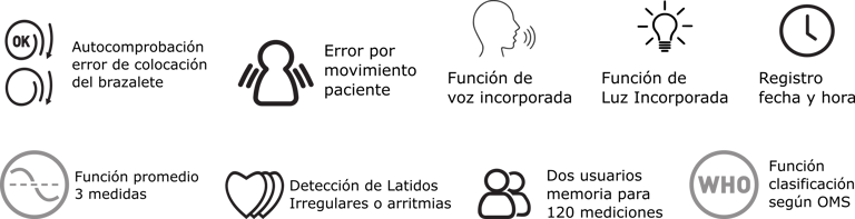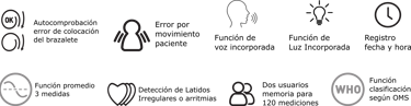 ▪ Autocomprobación del brazalete: Indica si el brazalete está colocado correctamente para asegurar la precisión.